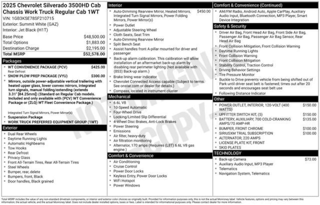 If you're in the market for a hardworking, dependable, and feature-packed work truck, the 2025 Chevrolet Silverado 3500HD Work Truck is the perfect choice. Experience the uncompromising power and versatility of this exceptional vehicle. Visit our showroom today and let us demonstrate how this Silverado 3500HD can take your business to new heights. Price includes $14,315 in dealer added accessories.