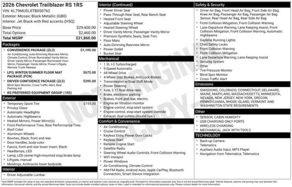 Schumacher Chevrolet of Boonton is excited to offer this wonderful 2026 Chevrolet TrailBlazer RS in Mosaic Black Metallic Beautifully equipped with Convenience Package (1 Type-A & 1 Type-C USB Charging-Only Ports, 120-Volt Power Outlet, Cabin Humidity Sensor, Dr & Fr Passenger Illuminated Vanity Mirrors, Hands Free Power Programmable Liftgate, Inside Rear-View Auto-Dimming Mirror, Single-Zone Automatic Climate Control, and Wireless Charging), Driver Confidence Package (Lane Change Alert w/Side Blind Zone Alert, Rear Cross Traffic Alert, and Rear Park Assist), Preferred Equipment Group 1RS, Winter/Summer Floor Mat Package (LPO) (Front & Rear All-Weather Floor Liners (LPO) and Premium Carpeted Floor Mats), 1 Type-A & 1 Type-C USB Ports, 2-Way Power Driver Lumbar Seat Adjuster, 3.17 Final Drive Axle Ratio, 4-Way Manual Front Passenger Seat Adjuster, 4-Wheel Disc Brakes, 6 Speakers, 6-Speaker Audio System Feature w/Amplifier, 8-Way Power Driver Seat Adjuster, ABS brakes, Air Conditioning, Alloy wheels, AM/FM radio: SiriusXM, Apex Red Two-Tone Roof, Auto High-beam Headlights, Brake assist, Bumpers: body-color, Compass, Delay-off headlights, Driver door bin, Driver vanity mirror, Dual front impact airbags, Dual front side impact airbags, Electronic Stability Control, Emergency communication system: OnStar and Chevrolet connected services capable, Evotex Seat Trim, Exterior Parking Camera Rear, Flat-Folding Front Passenger Seatback, Front anti-roll bar, Front Bucket Seats, Front Center Armrest, Front reading lights, Front wheel independent suspension, Fully automatic headlights, Heated door mirrors, Heated Driver & Front Passenger Seats, Heated front seats, Heated steering wheel, Illuminated entry, Knee airbag, Low tire pressure warning, Mechanical Jack w/Tools, Occupant sensing airbag, Overhead airbag, Overhead console, Panic alarm, Passenger door bin, Passenger vanity mirror, Power door mirrors, Power driver seat, Power steering, Power windows, Radio data system, Radio: AM/FM Stereo Audio System, Rear seat center armrest, Rear side impact airbag, Rear window defroster, Rear window wiper, Remote keyless entry, Ride & Handling Suspension, Security system, SiriusXM Trial Subscription, Speed control, Split folding rear seat, Spoiler, Steering wheel mounted audio controls, Tachometer, Telescoping steering wheel, Tilt steering wheel, Traction control, Trip computer, Variably intermittent wipers, Wheels: 19 High Gloss Black Machined Aluminum, and Wireless Apple CarPlay/Android Auto!