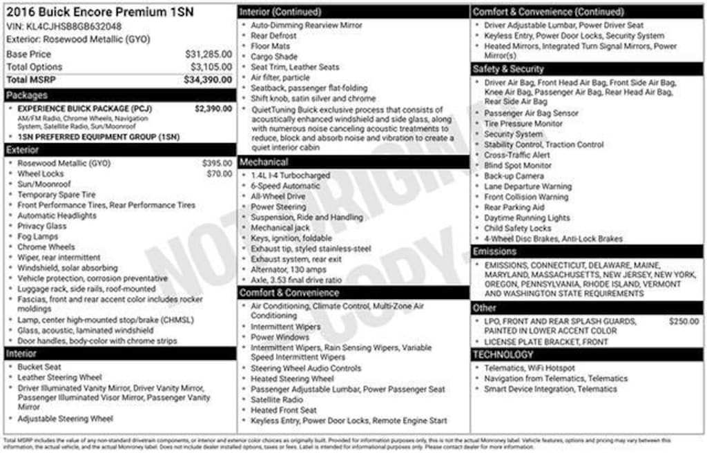 Deep Espresso Brown Metallic 2016 Buick Encore Premium 4D Sport Utility AWD 6-Speed Automatic Electronic with Overdrive ECOTEC 1.4L I4 SMPI DOHC Turbocharged VVT 23/30 City/Highway MPG