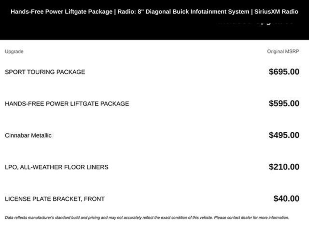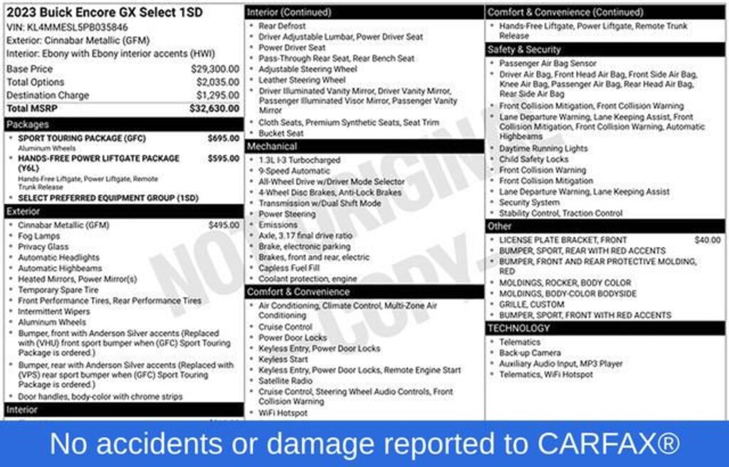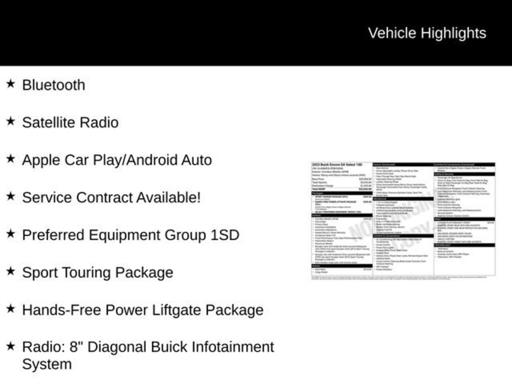 Discover the perfect blend of style, performance, and convenience in the 2023 Buick Encore GX Select. This exceptional SUV is designed to elevate your driving experience and exceed your expectations.- Bluetooth- Satellite Radio- Apple CarPlay/Android Auto- Service Contract Available- Hands-Free Power Liftgate- Sport Touring Package- Wireless Apple CarPlay/Wireless Android Auto- Heated Front Seats- 18 Machined Aluminum Wheels- Ride & Handling Suspension- 4-Wheel Disc Brakes- ABS Brakes- Front Wheel Independent Suspension- Occupant Sensing Airbag- Red Front & Rear Bumper Protective Molding- Auto High-Beam Headlights- Front Fog Lights- Fully Automatic Headlights- Body Color Rocker Moldings- Body-Color Bodyside Moldings- Custom Grille with Red Accents- Sport Front Bumper with Red Accents- Sport Rear Bumper with Red Accents- Sport Touring BadgePowered by the efficient ECOTEC 1.3L Turbo engine and paired with a 9-Speed Automatic transmission, the Encore GX Select delivers an impressive 26 city/29 highway MPG, ensuring you can explore the open road with confidence. The available all-wheel drive system provides enhanced traction and control, making it the perfect companion for any adventure.Step inside and you'll be greeted by a wealth of premium features, including the 8-inch Buick Infotainment System with wireless Apple CarPlay and Android Auto, allowing you to seamlessly integrate your smartphone. The hands-free power liftgate and heated front seats add an extra layer of convenience and comfort to your daily drives.But the true standout of this Encore GX is its bold and sporty styling. The Sport Touring Package elevates the exterior with unique body-color moldings, a custom grille with red accents, and 18-inch wheels with a distinctive dark Android high gloss finish. This vehicle is sure to turn heads wherever you go.Whether you're looking for a capable and versatile SUV or a stylish and tech-savvy ride, the 2023 Buick Encore GX Select is the perfect choice. Experience the difference for yourself by scheduling a test drive at our dealership today. We're confident you'll be impressed by the exceptional value and driving dynamics this vehicle has to offer.