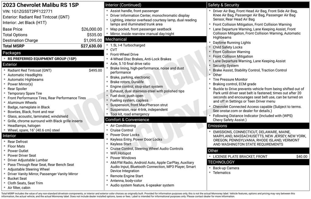 Radiant Red Tintcoat 2023 Chevrolet Malibu RS 4D Sedan FWD CVT 1.5L DOHC 27/35 City/Highway MPG