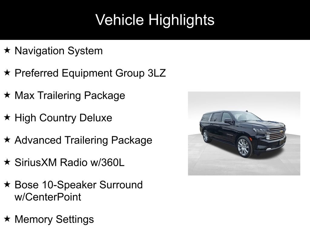 Imagine yourself behind the wheel, surrounded by the Suburban High Country's luxurious cabin and advanced technology. The available 15-inch Head-Up Display puts vital information right in your line of sight, while the intuitive Infotainment system with Apple CarPlay and Android Auto seamlessly integrates your digital life. The Bose audio system delivers a concert-hall experience, while the Adaptive Cruise Control and Lane Change Alert with Side Blind Zone Alert provide added peace of mind on the road.