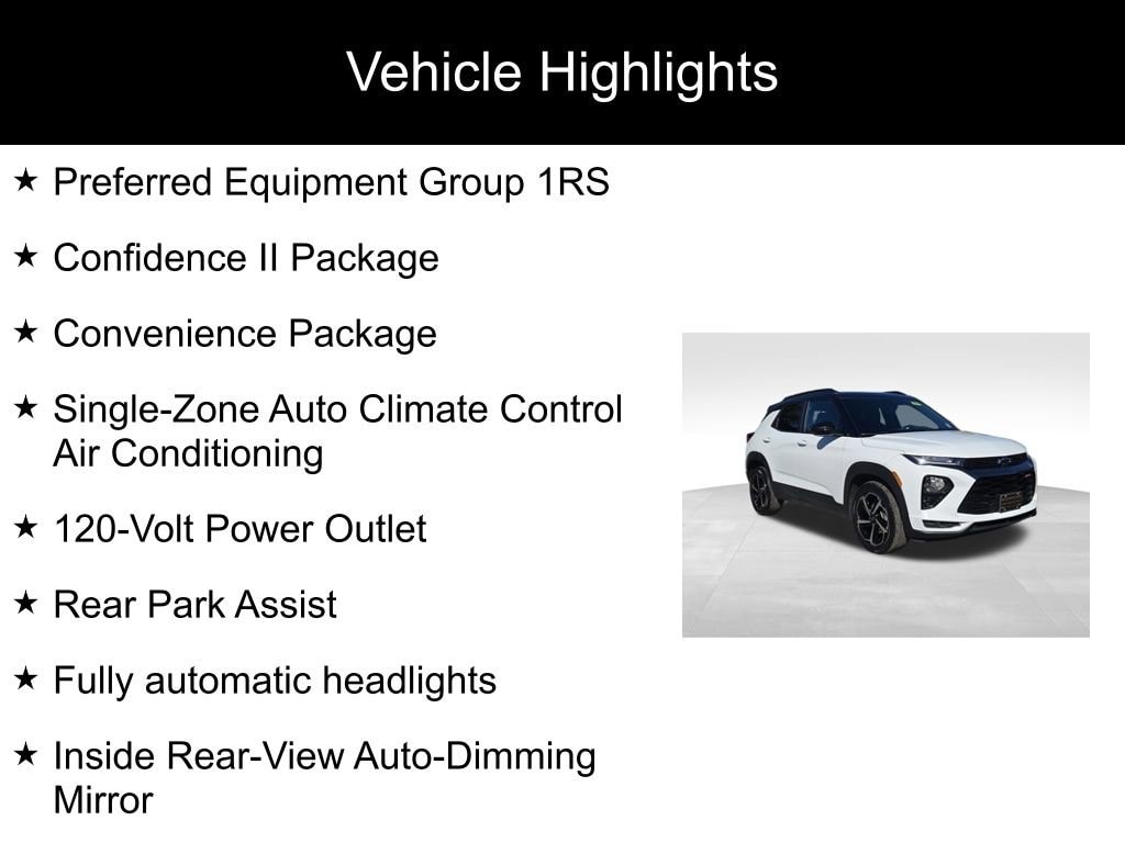 TrailBlazer RS, 4D Sport Utility, 1.3L Ecotec Turbo DOHC SIDI w/VVT, CVT, FWD, Summit White, Jet Black With Red Accents Cloth, 120-Volt Power Outlet, 8 Diagonal Color Touchscreen Display, Cloth w/Leatherette Seat Trim, Confidence II Package, Convenience Package, Driver & Front Passenger Illuminated Vanity Mirrors, Fully automatic headlights, Heated Driver & Front Passenger Seats, Heated Steering Wheel, Inside Rear-View Auto-Dimming Mirror, Preferred Equipment Group 1RS, Rear Park Assist, Single-Zone Auto Climate Control Air Conditioning, Wireless Apple CarPlay/Android Auto.